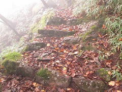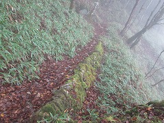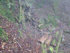 石丸峠から小菅側を見ると熊笹が被っているのが見えるが被っているのは見えている所のみ。石丸峠から見えている部分より下は笹があったとしても広い路盤にスズタケが低く生えているだけである。天狗棚山北東斜面トラバースから尾根の南側に入って横駈け道となる。長峰分岐の手前で左(北側)に小さい切替に続けて大きな切替跡の入口がある。米代(こめでえ)の長峰分岐を過ぎてからがカゴカケの難所でまずは高い急斜面のトラバース、続けて大岩の間を抜けて急斜面のジグザグ下降、更に急斜面のトラバースで尾根筋に出る寸前で先に長峰分岐の上で左に分れた切替の旧路盤が合流し、石に彫られた階段を三段くらい下がって尾根筋に出てカゴカケが終る。カゴカケはカンガケとも言ったというから、垂直に近い斜面を言った「かね(矩)・かけ(崖)」の転がカゴカケ/カンガケだろう。米代はその斜面の上ということの「かね(矩)・ど(処)・うへ(上)」の転が「コメデー」でないかと考えてみる。