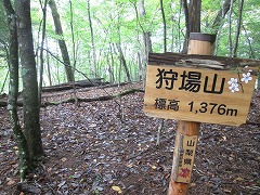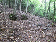 狩場山(1376m)は路盤は山頂を通らないが一帯にヤブは無く山頂に標識だけがある。狩場山の辺りは栗の木が多い。狩場山を下りた鞍部の手前に炭釜が二基ある。鞍部は棚倉沢沿いに小菅川まで下りていく道の分岐するショナメと言われる所で、鞍部の東側の道の北側に基壇のような石組がある。石組の上に白樺の若木が一本生えており、石組を崩して散らかしたように石が道に散乱している。通った時は或いは狩場明神社があった所かと考えたのだが、帰宅して岩科「大菩薩連嶺」を読み返すと場所が大部違う。或いはこれも炭釜の跡なのか。ショナメは小菅村郷土小誌の地図で「辷場」とある所のようで、フリガナがないが「すべりば」だったのが訛って「ショナメ」なら、元は「すみ(炭)・にば(荷場)」で、山の炭荷の集荷地点、牛ノ寝通りで生産された炭の出荷地点として名付けられたか。
