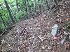 大ダワから道の整備が一段良くなる。だが、大マテイ山西面の急斜面のトラバースで頂近い故か流れたり抜けたりした形跡は多くはないがある。尾根東側に移る所で大マテイ山北尾根を見上げると急斜面で尾根筋を上れる気がしない。山沢川の詰めに下りる道を分けて東斜面に移っても急斜面トラバースである。山沢川支流の高指沢の源頭の山ということの高指山の西面の急斜面に移って慶応年間の馬頭観音を道端に見る。馬の事故などで祀られることの多い馬頭観音があるということは慶応の頃は街道として使われたのかもしれないが、尾根筋の起伏激しく急斜面トラバースの長い大ダワからモロクボ平は比較的新しく、大ダワまで別のルートで上がってきた時代があったのでないかと思い始める。