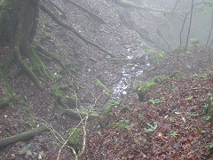 カゴカケより下が玉蝶でまた南側の横駈けで玉蝶山の盛り上がりの頂は通らず過ぎて、ジグザグで斜面下りて1520mで環状林道分岐。玉蝶沢源頭の水場へは環状林道に入って約3分だが、環状林道の道の所は倒木の詰まった滝の下の砂利で水が汲みにくい。道の4mほど下で沢筋が緩くなっていて小さな水面があるが周りの斜面は土だが急である。玉蝶(たまちょう)とは、小菅側から見て山越え地点となる石丸峠の手前の段である「つ」が tu であった頃の「つま(端)・つ(助詞)・を(峰)」ということでなかったか。