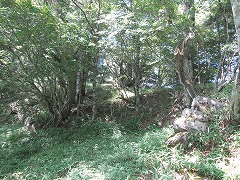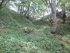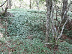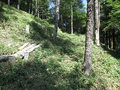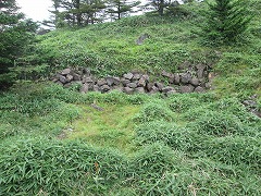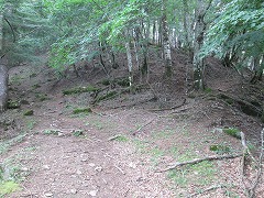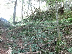 標高1710m辺りで尾根が広がり一旦平坦になって路盤が車道幅となって轍が二本あるように踏み跡が見える。右に逸れていく踏み跡もある。直進が古い道で、右に逸れていくのは先の傾斜がかかる部分の傾斜を緩めるべく北側の尾根に回り込む新しい作業道の路盤のようである。1740m辺りで風当たりの弱そうな尾根の南側に入りこむ。尾根筋から一段下がった所に路盤が広がり、道の尾根筋側に両脇を石組のように見える積石で仕切られた小平坦地があり、明治12年まで使われた荷渡場の跡だという。田島勝太郎(1935)は「藪の中」と記すが、年月が経って周りの樹木が成長し日陰になったからであろう靴の高さほどの浅い笹の中である。