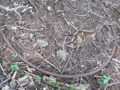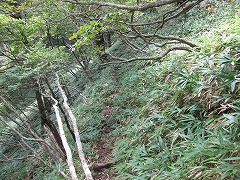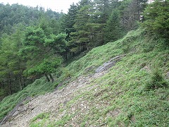 更に50mほど路盤の道を上がると幅10mほどの流れた岩盤草付きでまた路盤がなくなる。草がついているのでここも流れたのは古い話だと思う。岩盤草付きの先の30mほども笹の緩い斜面なのだが路盤が見当たらない。もう賽の河原の避難小屋が同じ高さで100m以内に見えているのだが、大正頃だという植林の作業時に旧路盤を崩したか。