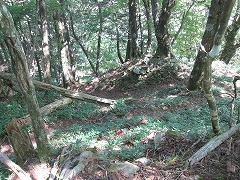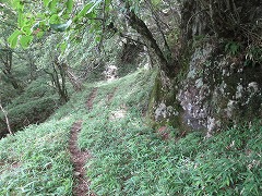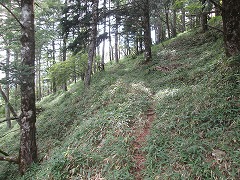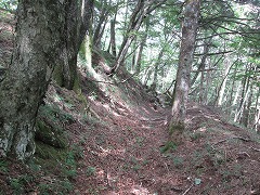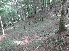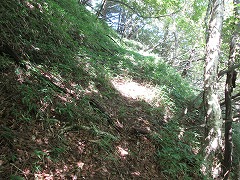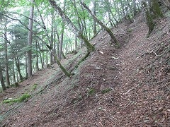 上で二筋が合流してから掘り込みの法面に大きな岩が目立つようになる。尾根としては緩傾斜で、一部の傾斜のきつい部分も丁寧にジグが切られて歩きやすいが、本来は険しい道だったと思う。