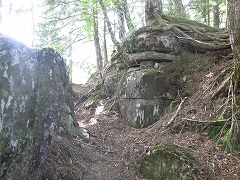 ![]() 大岩の根の先に 環状林道などとの十字路 |