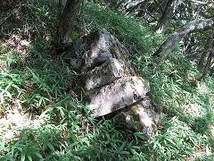 避難小屋まであと70mと言った辺りで路盤がはっきりする。ちょうど小菅村と甲州市の境の辺りである。道の妙見の頭側に鉄骨の突き出したコンクリの建物の跡のような遺物と取り囲む石垣を見る。地形図に記念碑のマークのある所なので建物ではなく記念碑を撤去した跡なのか。笹の茂る路盤のまま避難小屋前の旧峠に出る。