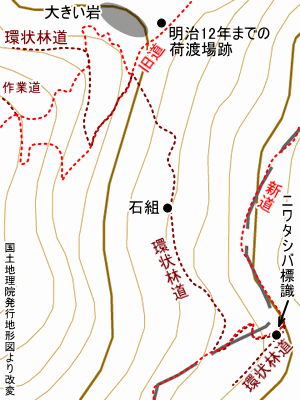 ウロの先の十字路から環状林道を下ると途中に石組と段切りがある所が中ほどに一ヵ所あって、すぐにニワタシバに下り着く。樵路巡遊は十字路の右折からの尾根筋道を作業道として十字路直進を旧丹波山大菩薩道とするが、掘り込みと曲りがあるので十字路右折も作業道ではなく旧丹波山大菩薩道で、切り替えによって二筋になっていると考える。フルコンバ鞍部からすぐの尾根筋にして20mほどと、標高1790m辺りの尾根筋にして20mほどと、この1810mから1840mの尾根筋にして70mほどの三ヶ所が二筋になっている所の内で新道開通前の切り替えによって二筋になっていると見た。