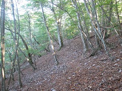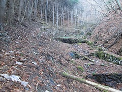 山沢川左股の林道は上水施設の所が車止めで、先で橋で右岸に移り、車道幅の終点はワサビ田になった枝谷の出合で歩道を直進するとトチ巨樹コースと山沢川の詰めの高指山の北の鞍部へ続く。左に折れてワサビ田に沿って枝谷の右岸を上がっていく。ワサビ田の頭の左岸の小尾根の頭が見えてくる辺りで左に折れて斜面をトラバースで上がる。次の右に折り返すジグの先で小さい緩やかな窪地斜面に入る。