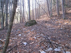 ![]() ヤモウ尾根分岐に下りつく 右端に写る岩が目印 |