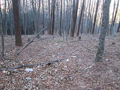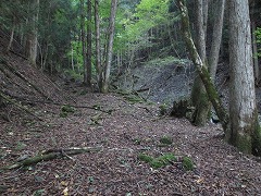 西側に炭釜の跡を見る。緩い谷間から斜面をもう一段上がって1060mの台地に上がる。台地は真っ平らで、奥に見えるヤモウ尾根の上の続きの末端斜面の突き出しにまっすぐ進む。突き出しの所が四差路だが、ヤモウ尾根の下側の尾根筋から上がってくる路盤は四差路付近ではほぼ分からない。右に折れるのが山沢入のヌタへ上がる道で、直進は鶴寝山北面の巻道に突き当たる。