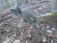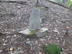 掘り込みのある尾根筋を下降していく。標高1050〜1000m辺りは植林と二次林の合間にアセビが茂った尾根筋である。アセビを見なくなり960mで掘り込みの右(東)側に「バリエーションハイキング」にある「石碑」を見る。石碑は道の斜め向こうを向いていて、川原石に線刻で「奉納大山祇命」とあり、山の神の碑である。年記と裏面の文字は私には読み取れず。曲がりくねった地面に立つ長い針金に五円玉を沢山通した賽銭がある。「バリエーションハイキング」の「石碑」が街道であったことの傍証になる石碑かもしれないと思って見たが、山の神なら街道であったこととは関係なさそうである。