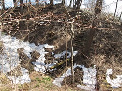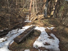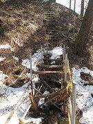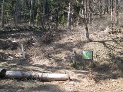 林道カーブに上がった所で左折して少しトラバースして、茨の混じるヤブの階段を登って標高550mで小さなコブの肩を乗り越す。コブの裏手の谷間を少し下ってコブの真裏からまた登るのだが、谷間の真裏に橋の跡がある。コブの上が展望台とされた時期があったのか肩からコブに上がってコブの裏面の急斜面を階段で下りて谷間に架かる橋を渡って登った時期があったようである。このコブは地すべりで山から剥がれた斜面の上端でないかと思う。コブの頂の周りは木が生え今は特別展望が良いということは無い。