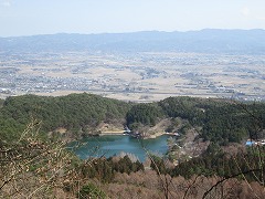 標高600mの広い段に上がって左折して道は南西に段の縁を行くのだが、右折して林道の方へ連絡する古い路盤の跡もある。段の縁の下は切れ落ちているが樹木は多く東側がすっきり見渡せるのはベンチのある一ヶ所だけである。段の内側に入って三面張りの排水路を橋で渡る所がある。林道と連絡するT字路を過ぎて段に緩やかに傾斜がかかり登り始め、半田山自然公園南駐車場向かいからの登山道に合流する。