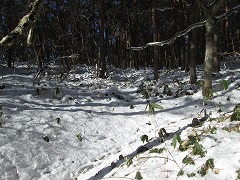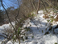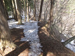 林道南半田赤坂線の半田沼の裏手に斜面安定工の為と思われる作業道がある。この作業道が北の斜面に延びているのに対して入口は作業道のすぐ北にあって入ってすぐに作業道に交差して斜面をまっすぐ登る。作業道より前からあった歩道だったようである。