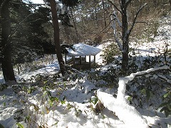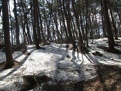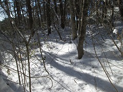林間駐車場が木の間越しに見える台地に上がるとまっすぐ東屋の上の今の登山道が曲がる所へ向かう。今の登山道の曲がる所を突っ切って更に西側へ続いている。