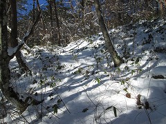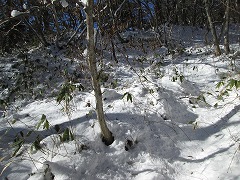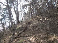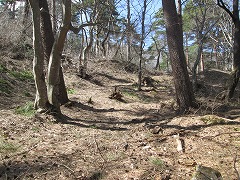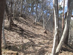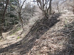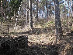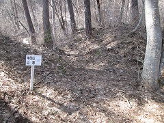 法面の上で二筋に分れる。東側の筋は斜面をトラバースで一定の勾配で上がっており新しい道と思われる。西側の筋は二度窪地の谷間を詰めて折れて短く斜面を上がっておりより古い道と思われる。